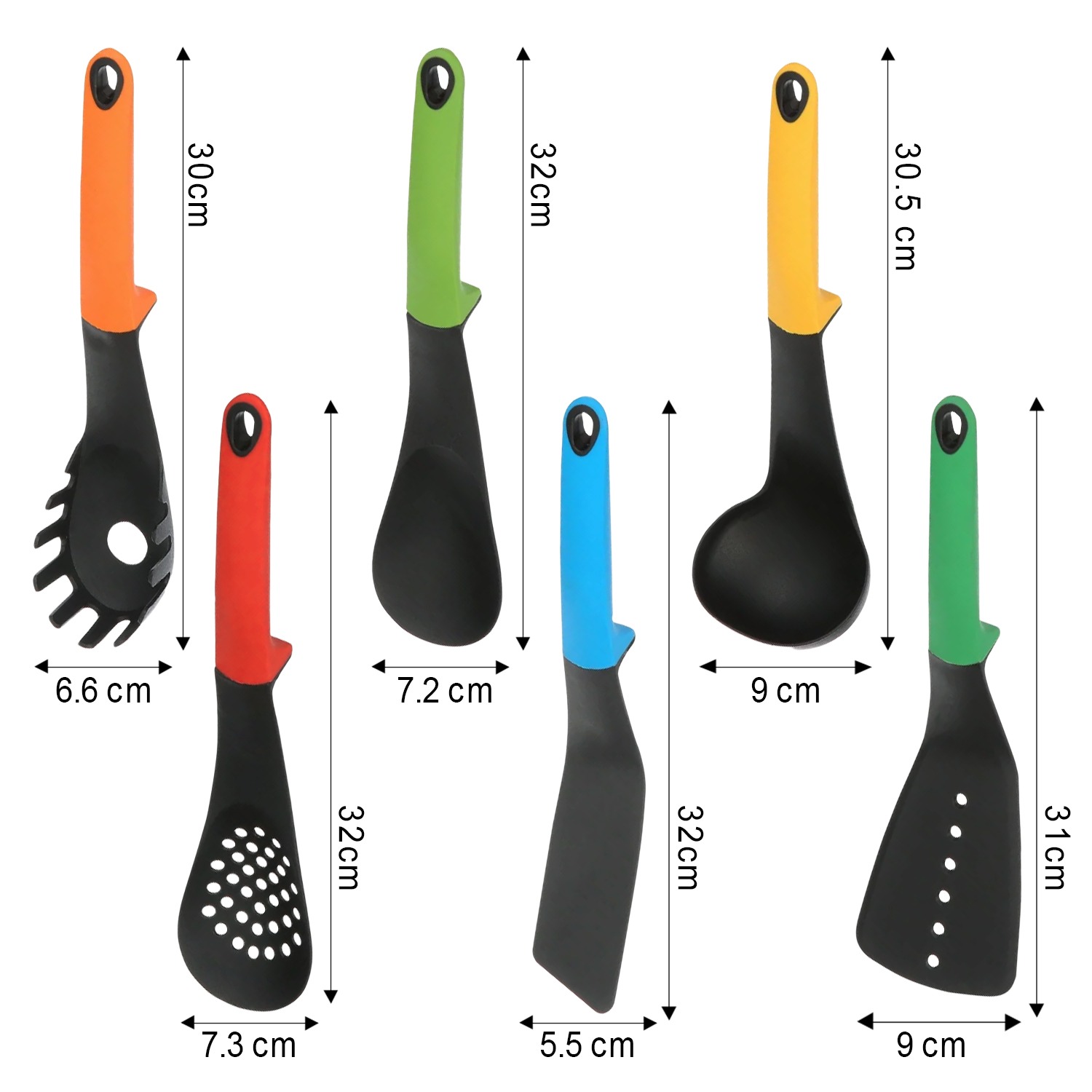 • What's Included in the Set - The Colorful 7-piece (6 kitchen tools and 1 organizer stand) Kitchen / Serving Utensils Set Includes: Spatula, Slotted Spoon, Slotted Turner, Ladle, Spaghetti Server, Solid Spoon and Organizing 360 Degree Rotating Carousel Stand